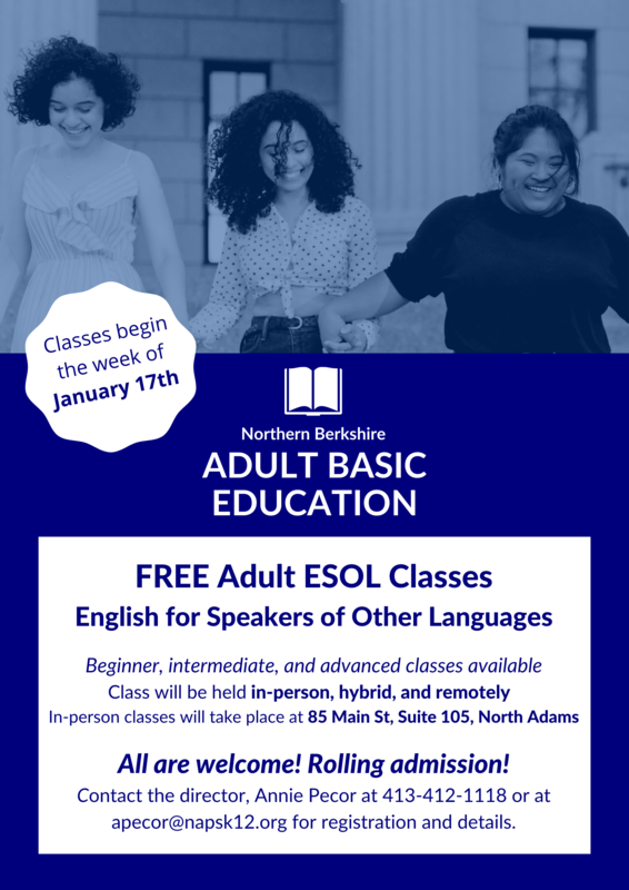 Both programs will begin the week of January 17th. In-person classes will take place at 85 Main Street, Suite 105 in North Adams. For more information, including registration information, please contact Annie Pecor at apecor@napsk12.org or at 413-412-1118.
