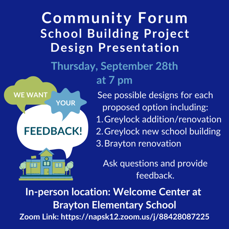 As part of this project, the school building committee will be implementing grade span schools (preK-2, 3-6, and 7-12) and considering site and design. Please plan to attend to hear about each of the designs and provide your input.