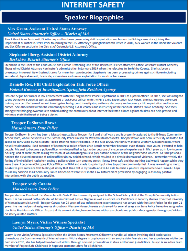 The Berkshire District Attorney’s office, in collaboration with the United States Attorney’s Office, the Federal Bureau of Investigation, Massachusetts State Police, North Adams Public Schools and Northern Berkshire Community Coalition invites you to a Project Safe Childhood Keeping Kids Safe and Secure Online evening internet safety presentation for parents. Details are below. Please feel free to share the attached flyer as well.