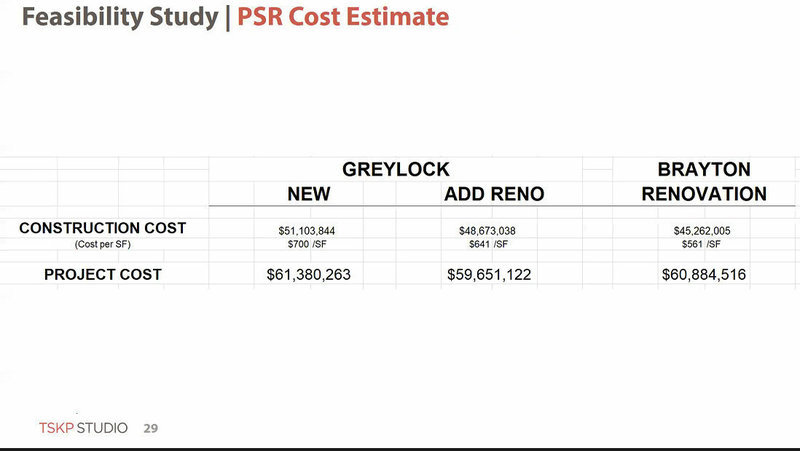 "Greylock new to me is like the clearest of all these," said committee member Benjamin Lamb, a parent. "At the new building, there's not all these unknowns that you can discover when you punch a hole in a wall or roof and when you're talking about the Y and you get to Brayton, it's like putting petroleum jelly all over that lens, right? ...