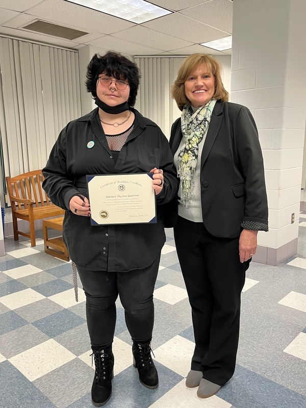 Evan-Quin May-Sims Goodermote poses with Superintendent Barbara Malkas